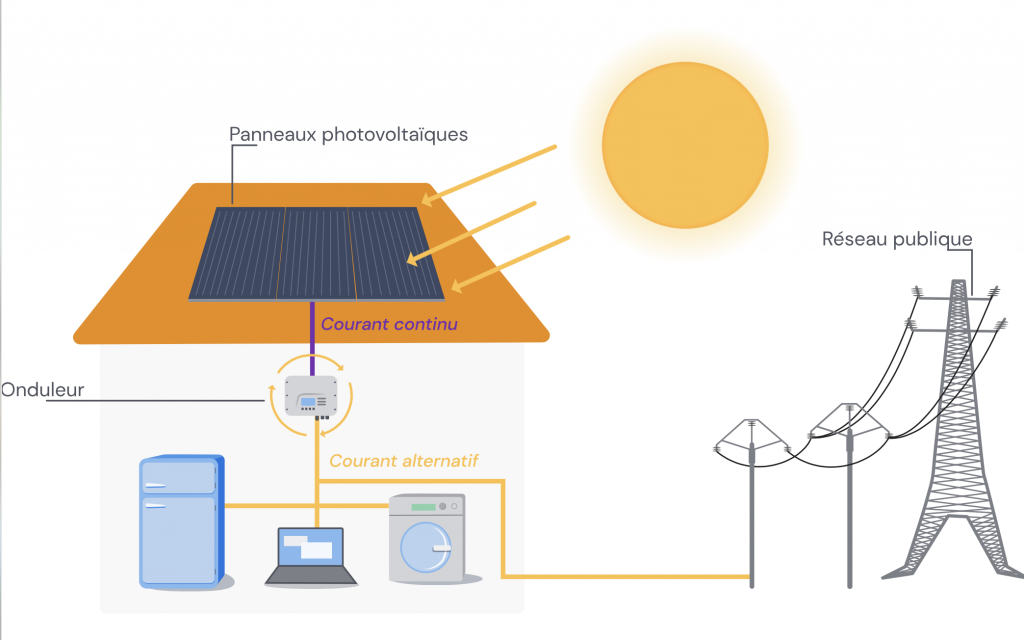 Le fonctionnement des panneaux photovoltaïques est simple : composés de matériaux semi-conducteurs, ils captent les rayons du soleil et convertissent cette énergie solaire en électricité. Cette électricité verte produite transite ensuite par un onduleur. Celui-ci transforme le courant continu, produit par les modules photovoltaïques, en courant alternatif utilisable sur le réseau.